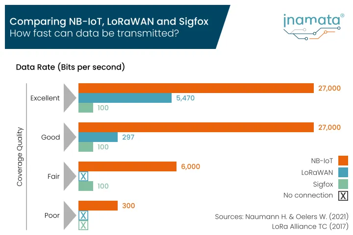 LoRaWAN et Sigfox ont mené l’adoption des réseaux étendus de faible puissance (LPWAN), mais ont depuis été dépassés par le déploiement de NB-IoT, une technologie radio basée sur LTE. La fiabilité de NB-IoT est inégalée et particulièrement ressentie dans les sous-sols.